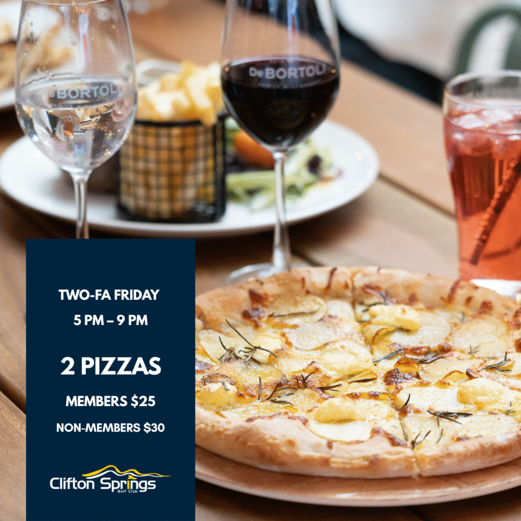 Join us every Friday and Saturday from 6-8pm for Happy Hour. Gather your friends, enjoy great drink specials, and take in the stunning views of the bay while you unwind. The perfect start to your weekend awaits at Clifton Springs Golf Club.